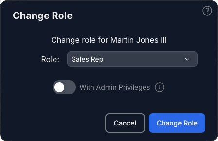 It's possible to assign admin privileges to a non-admin role. For example, to allow a Sales Rep to be able to manage subscriptions or delete the org. This is most useful for orgs with a single user where that user wants to act as a sales rep but still have full control over the account. The user who initially created the org may have admin privileges if they selected a Sales Rep or Manager role during onboarding. This can be changed later via the org's Manage Users menu option and then clicking the Change Role button next to the user: